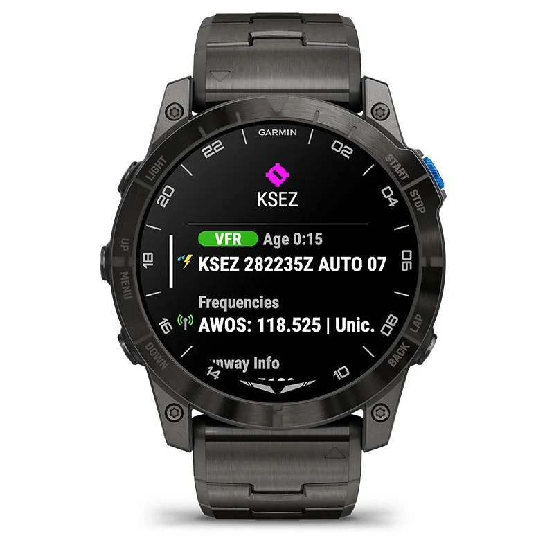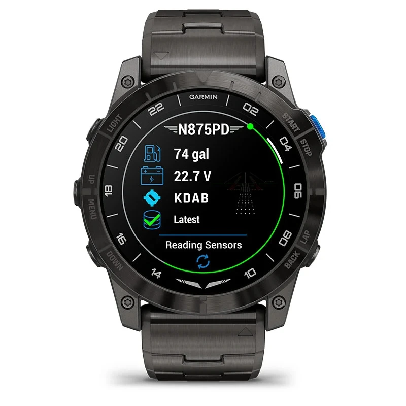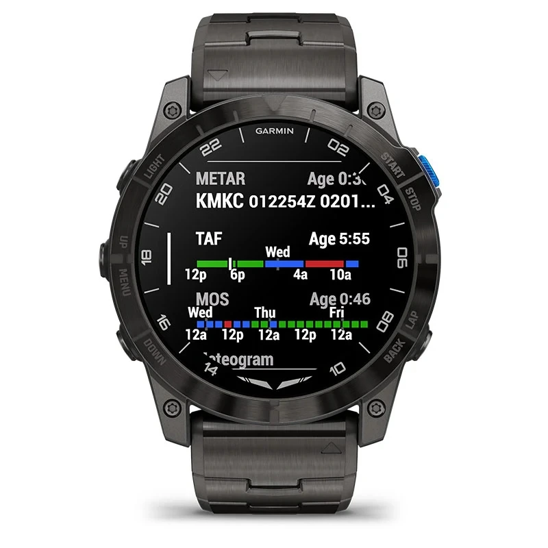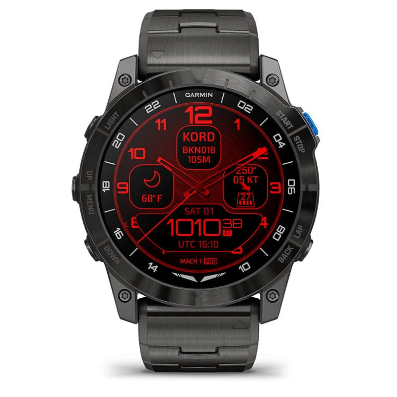 The stunning 1.4” AMOLED display is our highest-resolution aviator watch yet. The watch face comes standard with a UTC readout and airport weather.
