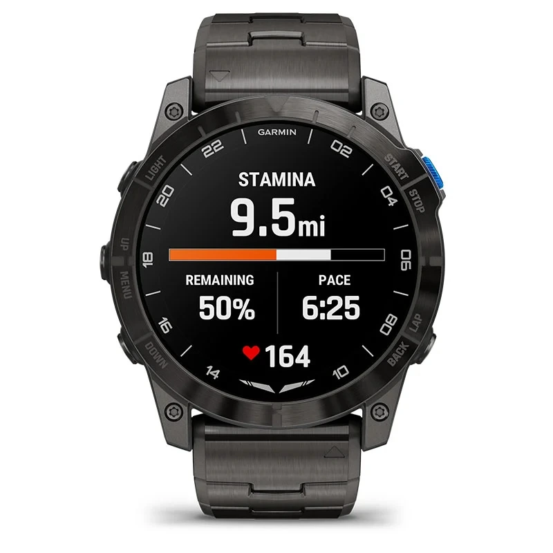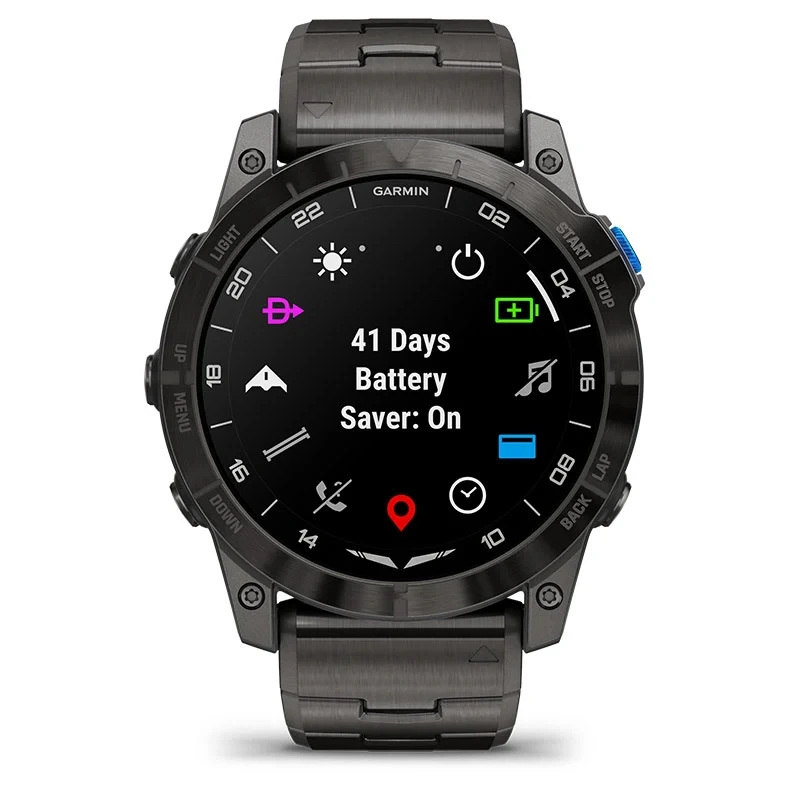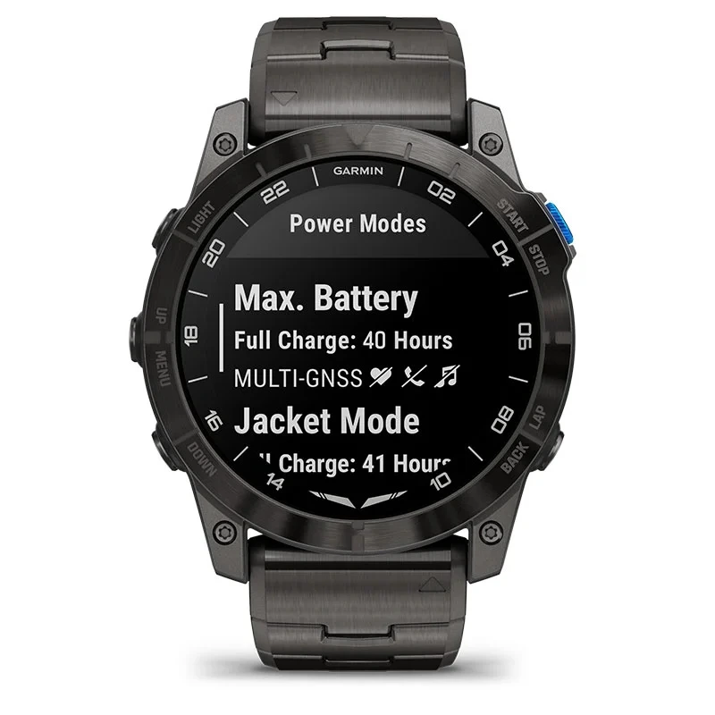 | Battery life | Smartwatch mode: Up to 25 days (10 days always-on) Battery Saver Smartwatch mode: Up to 41 days GPS only: Up to 82 hours (58 hours always-on ) All satellite systems: Up to 62 hours (48 hours always-on) All satellite systems with multi-band: Up to 38 hours (30 hours always-on) All satellite systems with music: Up to 17 hours Max battery GPS: Up to 145 hours Expedition GPS: Up to 27 days Fly activity (GPS + SpO2): Up to 46 hours |