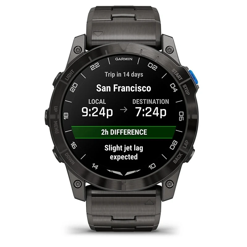 Stay on schedule when you travel with a UTC readout on the watch face plus the ability to display multiple time zones.