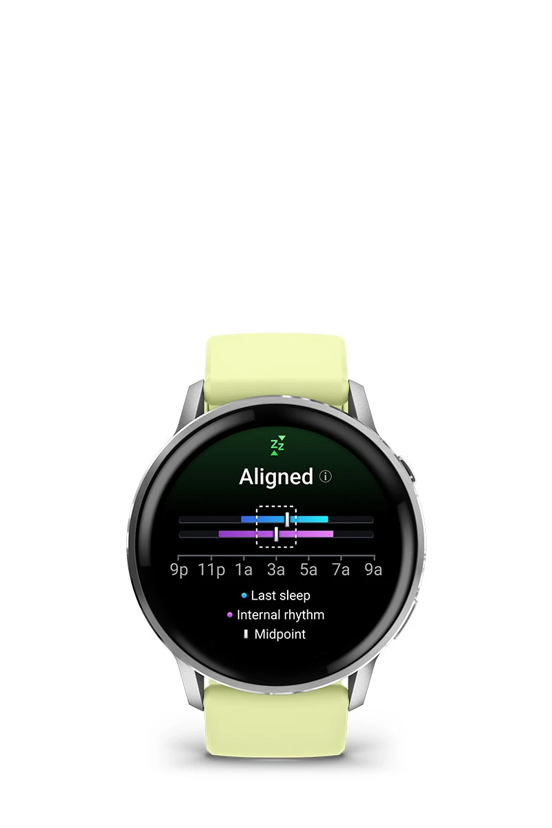 Get a sleep score and personalised coaching for how much sleep you need and how you can improve. Even keep track of different sleep stages and naps — and see key metrics, such as HRV status and skin temperature3, to better understand your health. Plus, with the sleep alignment feature, see how aligned you are to your circadian rhythm, and see your sleep consistency.